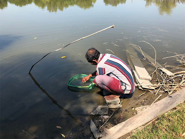 今回、インタビューを受けてくださったのは、シドアルジョ内の伝統的な粗放エビ養殖池の小作人であり、普段は池のすぐほとりにある小屋で妻と娘と暮らす50代の男性である。通常、彼は3名ほどの日雇い労働者とともに池の魚やエビの収穫作業を行うが、当該のアミ類が手に入った際にはトゥラシをつくり、それらを近くの市場で売って生活の足しにしている。原材料であるアミ類をどこから手に入れるのか尋ねると、エビが養殖されるまさにその池で獲れるのだと答え、収穫の様子を見せてくれた。アミを獲る際に使う道具は彼の手製のものであり、Tの文字のように二股に分かれた木の枝の先に、弧を描くように割いた竹をしならせて結びつけ、できあがった扇型の部分に目の細かな網がくくりつけられている。この道具を用いて、池の水面近くを泳ぐudang jembretを獲る。体長はおよそ1ミリから2ミリ程度である。たいてい、明け方前に収穫をするが、それは日が高くなると収穫が難しいからだと彼は言う。