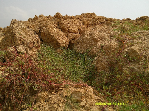 精製施設壁の外には、精製後のリン鉱石廃土が野積みされていた。