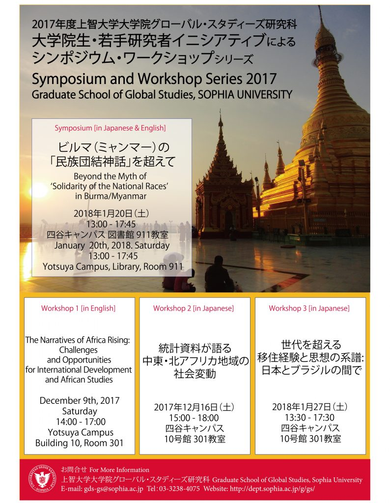 グローバル・スタディーズ研究科では、大学院生および若手研究者が中心となって企画・運営するシンポジウム・ワークショップシリーズを開催しています。その他、不定期に講演会も実施しています。